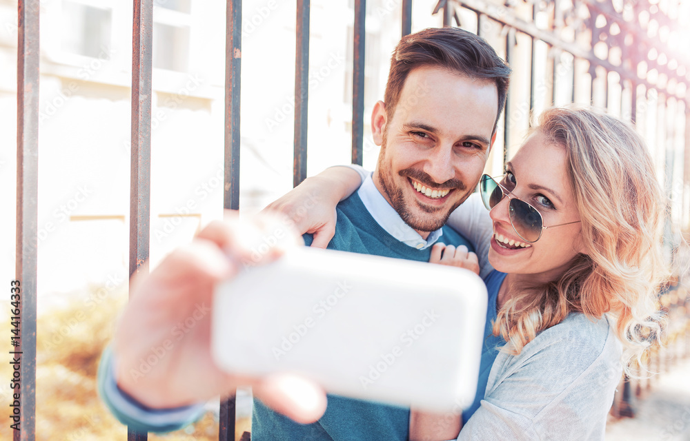 Young smiling couple taking a selfie with smart phone. Love and tenderness. Dating, lifestyle concept