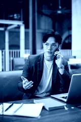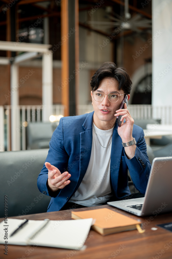 Asian man in blue suit explaining or talking on the phone sitting with laptop in cafe or coffee shop