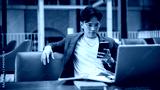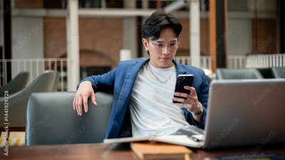 Asian man looking at phone while leaning on sofa backrest sitting with laptop in cafe or coffee shop