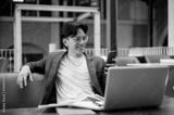 Asian man looking at phone while leaning on sofa backrest sitting with laptop in coffee shop or cafe