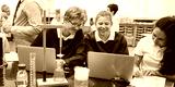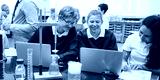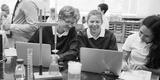 Students in a science lab working on laptops. Chemistry equipment on the table. Engaged students, collaborative learning, science education in action. Diverse students in science class.