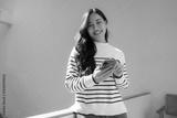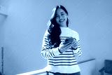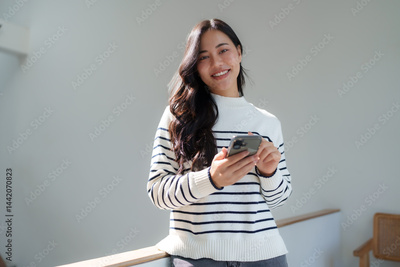 Young asian woman is using a smartphone and smiling while working remotely from home, wearing a striped sweater and leaning against a railing