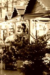 Traditional European Christmas plant poinsettia in a pot for sale at market. Beautiful Christmas market hut