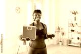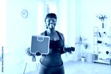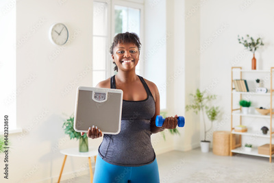 Young happy fat african american smiling woman holding scales and dumbbells and looking cheerful at camera after measuring her weight standing in living room at home. Weight loss and diet concept.