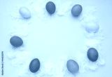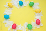 Easter yellow frame with eggs and feathers. Top view