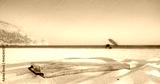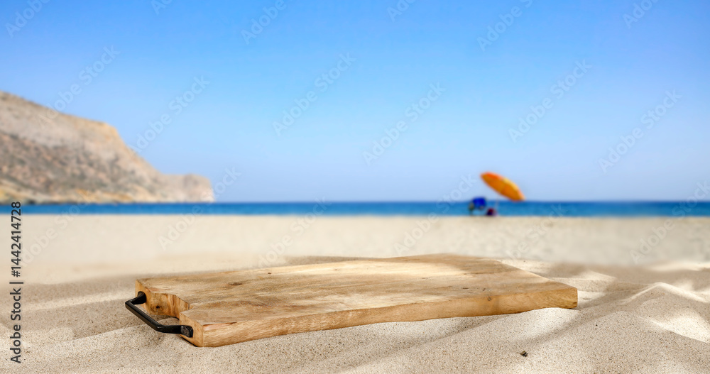 Beach sand with gentle imprints and marks - perfect minimalist background with wooden cutting board with blank space for advertising, branding, product mockups. Natural coastline scene in summer time.