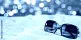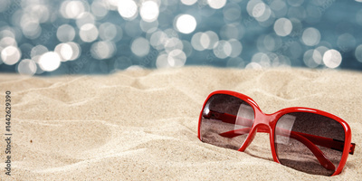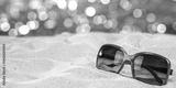 Close-up of sunglasses on sand on the beach and bokeh ocean waves. The soft lighting evoke calm coastal atmosphere. Copy space for product placement, creative projects and nature-inspired designs.