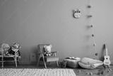 Cozy composition of blue living room interior with copy space, gray desk, green chair, plush dog, braided rug, colorful garland on wall, wooden wall, and personal accessories. Home decor. Template.