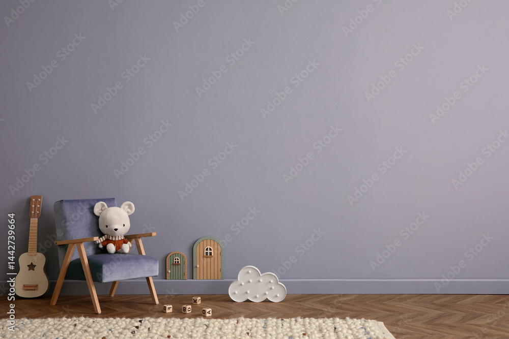 Cozy composition of blue living room interior with copy space, gray desk, green chair, plush dog, braided rug, colorful garland on wall, wooden wall, and personal accessories. Home decor. Template.