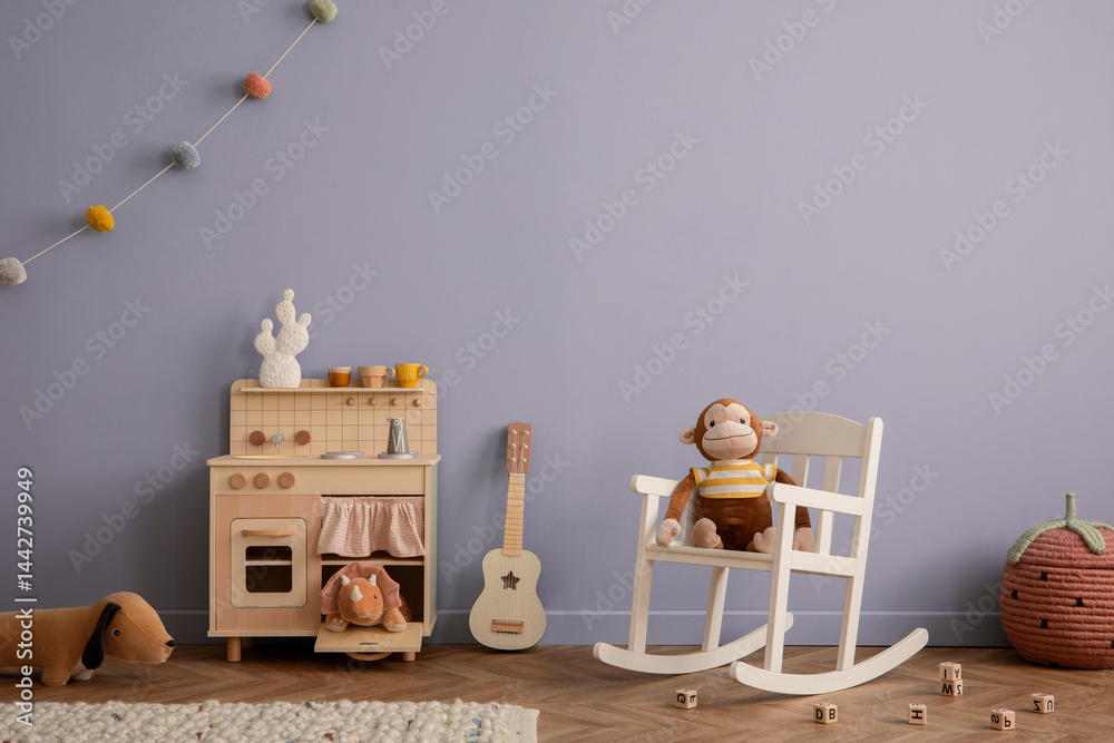 Cozy composition of living room interior with gray desk, green chair, guitar, kitchen for kids, colorful garland, plush toys, wooden block toys and personal accessories. Home decor. Template.