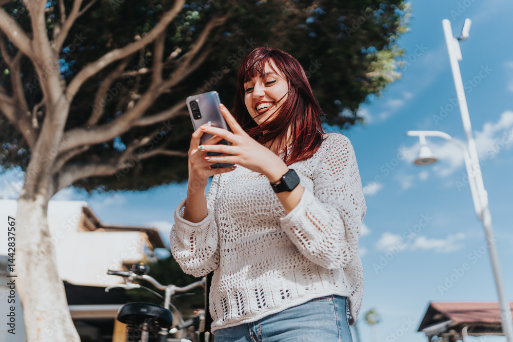 A cheerful woman using her smart phone while walking outdoors on a sunny day, showcasing a joyful moment and modern lifestyle.