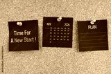 November 2026 calendar with Time for a new start and Plan text on black adhesive notes with wooden.