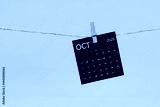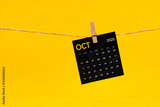 October 2025 black calendar hanged with brown rope on yellow.