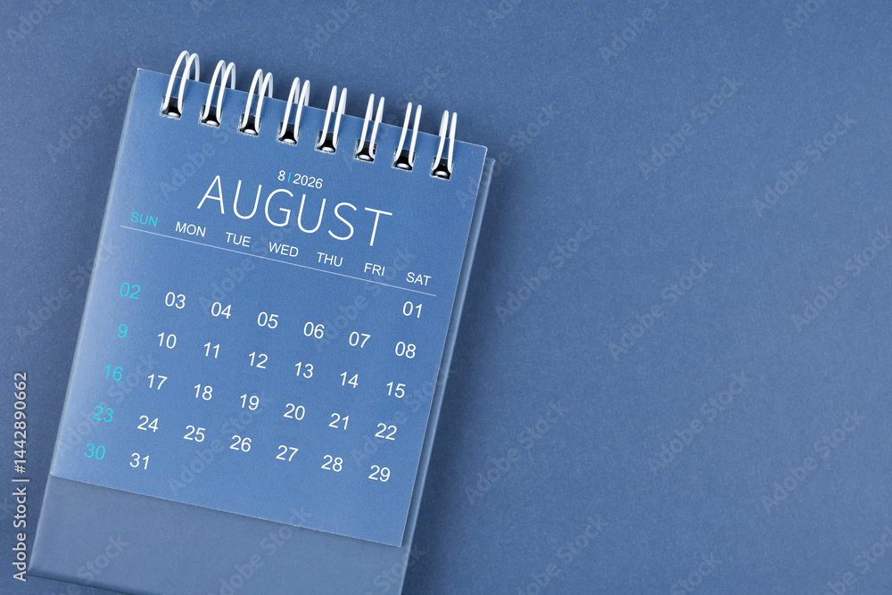August 2026 calendar on blue background. Desk calendar for planning and organizing.
