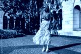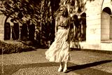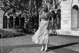 Elegant woman in tulle beige long skirt and fashionable sequin top posing in the city in summer sunlight. Summer urban fashion.