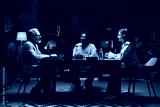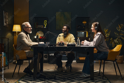 Young people sitting at table with microphones and talking to man during online podcast