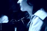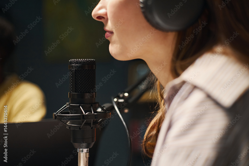 Close-up of young woman in headphones speaking in microphone during podcast with her colleague