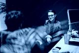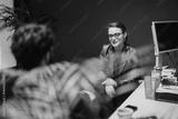 A businesswoman engages in a professional discussion with a client in a contemporary-designed office featuring a blue wall, a computer workstation, and a natural accent of green plants.