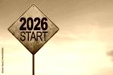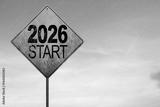 2026 Metal signpost with yellow dirty road sign. Image of a signpost pointing in the direction of the year 2026