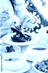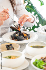 A close-up of a woman's hand expertly using a fork to select mussels from a plate, surrounded by bowls of vibrant dishes in a bright, modern dining setting.