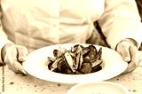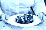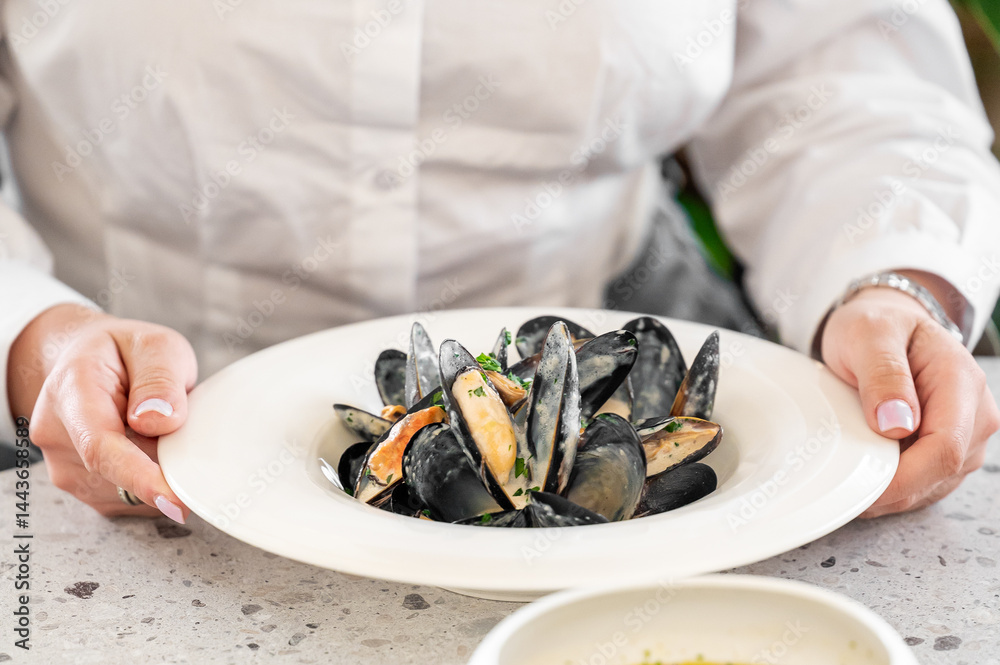 A person holds a pristine white plate filled with mussels, garnished with herbs. The vibrant seafood dish showcases a delightful dining experience in an elegant setting.