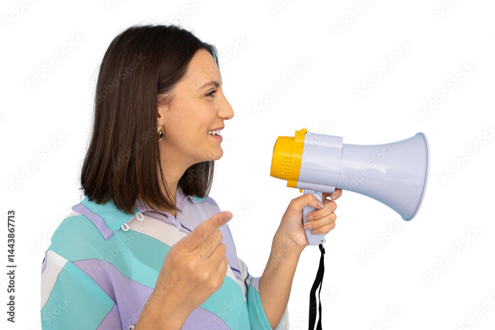 Female protester shouting through megaphone, raising finger emphatically against transparent backdrop