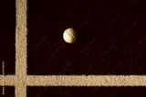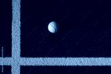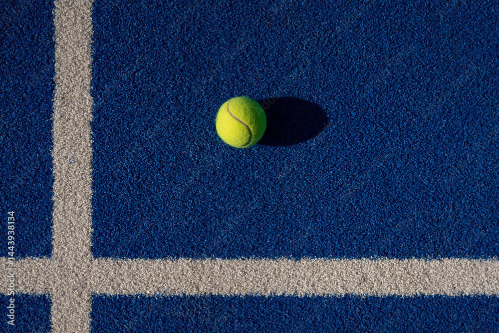 Top view of green padel ball casting shadow on blue textured court with white lines