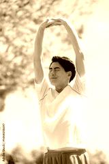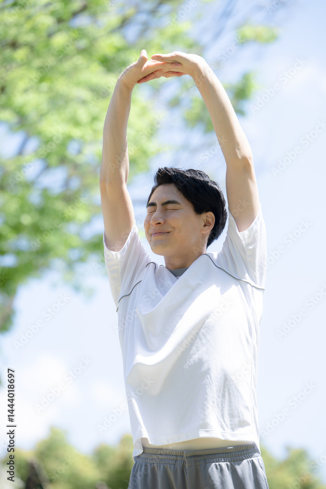 A man doing sports preparation exercises and stretching his arms and legs in the fresh green and blue sky Vertical