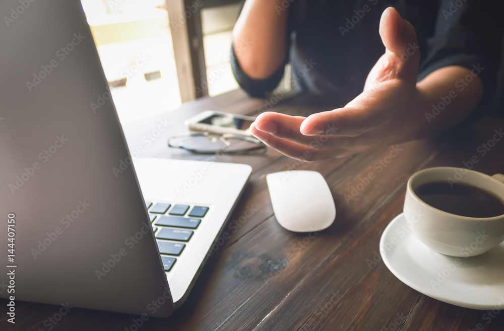 businessman hand working laptop on wooden desk in office in morning light. vintage effect