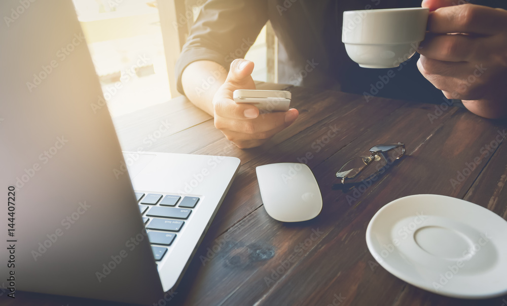businessman hand working laptop on wooden desk in office in morning light. vintage effect