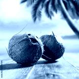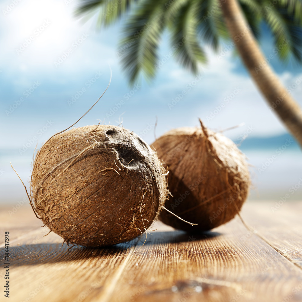 Whole coconuts on a wooden table with tropical beach and coconut palm trees in the background on a hot summer day.