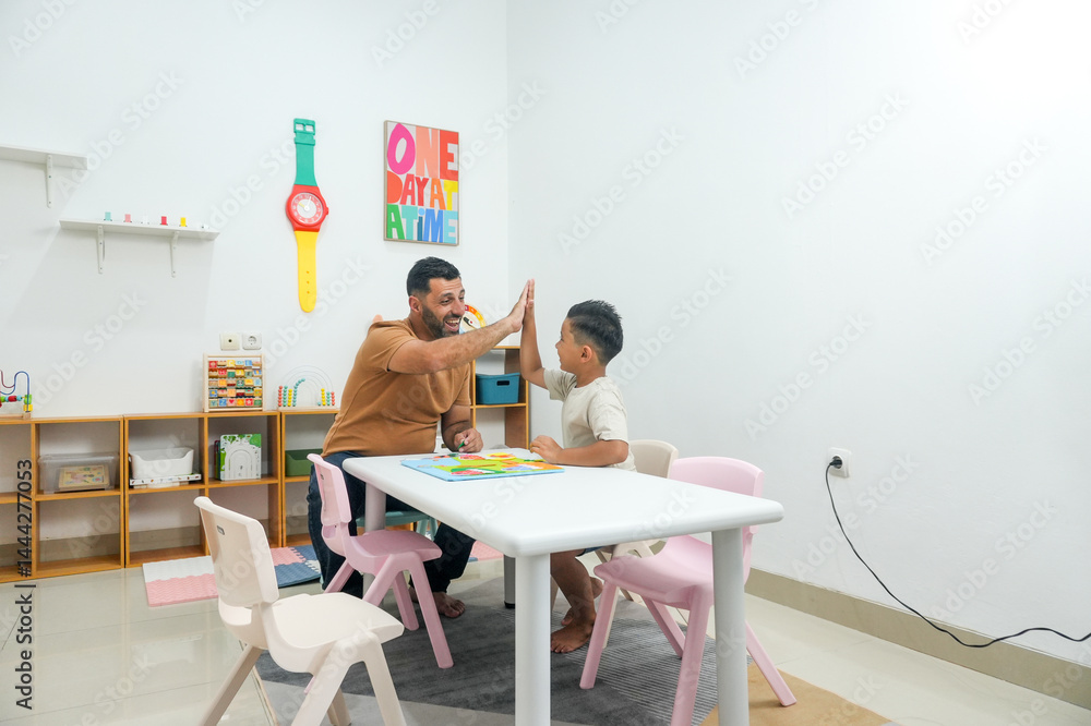 Happy Father And Little Son Making High Five While Playing Puzzle At Home