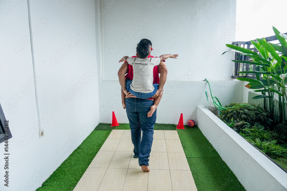 Father Carrying Son On His Shoulders Dressed As A Superhero