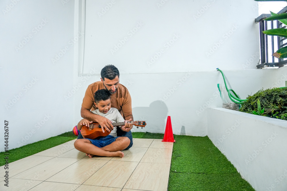 Middle Eastern Father Teaching His Son To Play Guitar Or Ukulele At Home Terrace