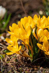 Golden crocuses bloom in the garden, heralding spring with their bright colors and soft petals