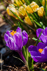 Purple and yellow crocus flowers thrive in a vibrant garden basking in spring sunshine