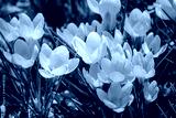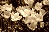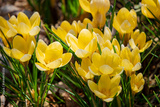 Vibrant yellow crocuses burst from the soil in a sunny garden, signaling the arrival of spring