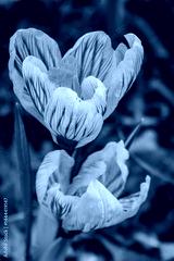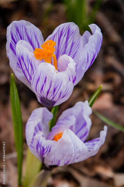 Two vibrant purple crocuses bloom, celebrating the arrival of spring