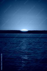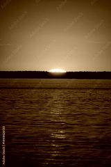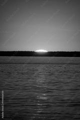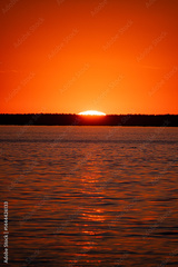 Warm hues fill the sky as the sun dips below the horizon, illuminating the calm water's surface