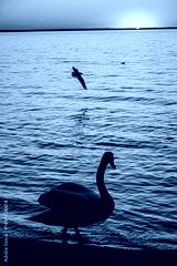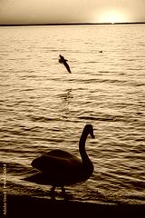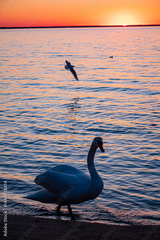 A graceful swan stands by the shimmering water as the sun sets, casting colorful reflections