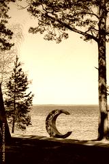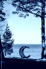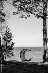 A crescent sculpture by the tranquil lake is framed by tall trees and a blue sky