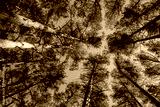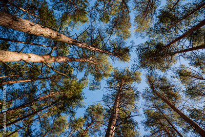 Pine trees stretch upward, showcasing the beauty of nature under a clear sky