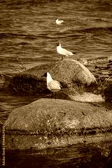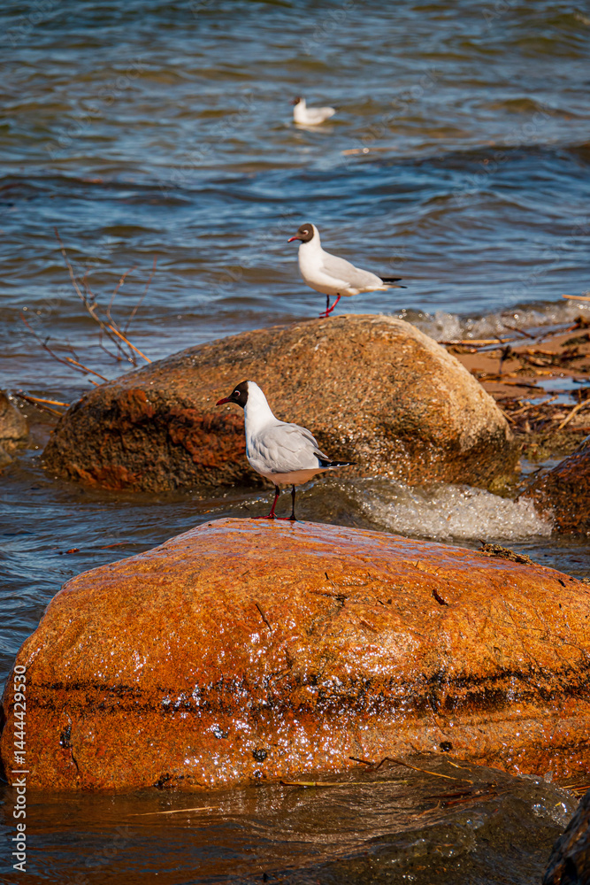 Graceful seagulls balance on rugged stones while the sun sets, casting warm hues over the water