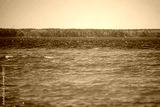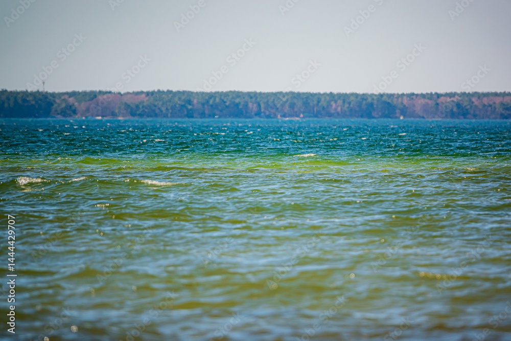 Gentle waves in blue and green meet a lush horizon, creating a tranquil scene