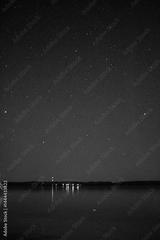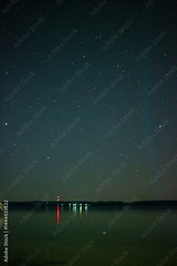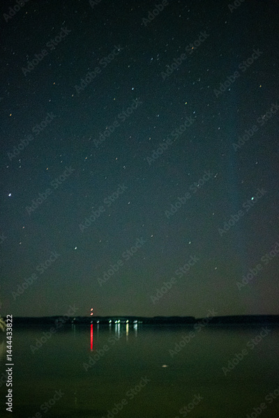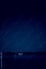 Stars twinkle brightly above a serene lake, with colorful lights shimmering in the water below