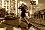 Stylish woman in black dress and combat boots confidently walking across a city crosswalk with modern urban background and red sports car