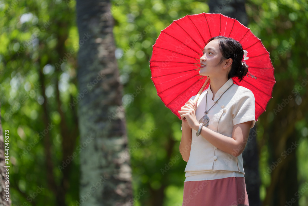 Wearing traditional thai clothing, a beautiful woman holds a red umbrella in a lush green park, enjoying the serene atmosphere and cultural heritage