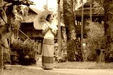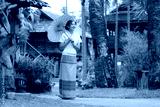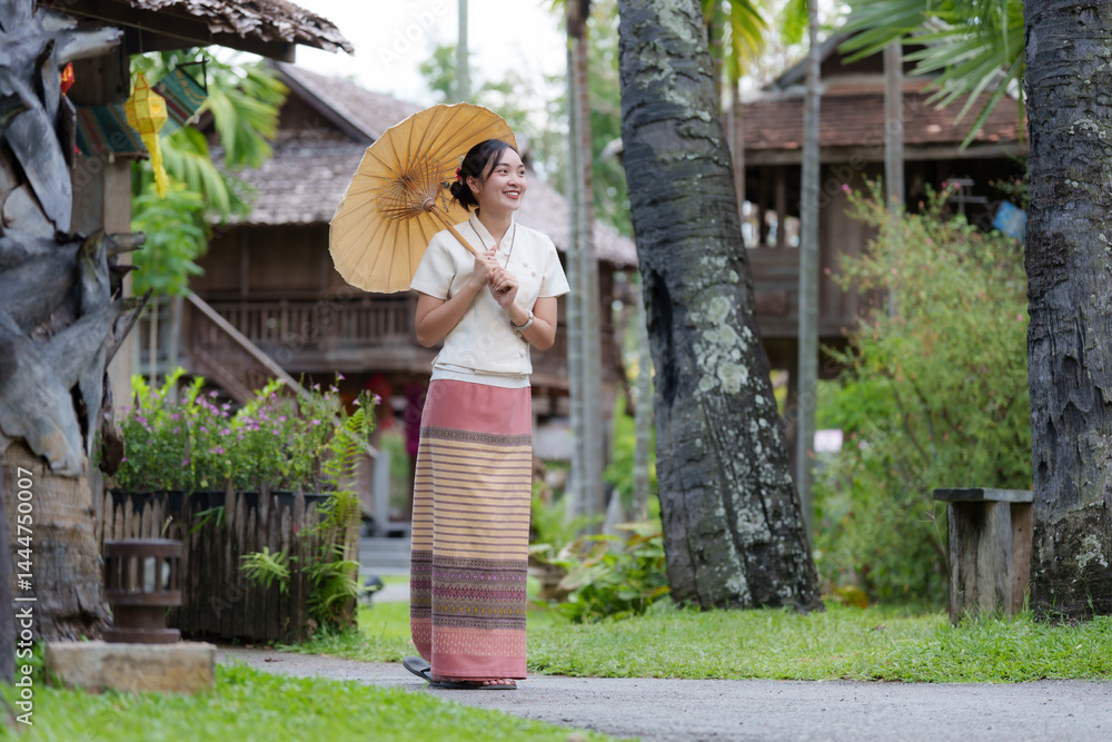 Beautiful young northern thai woman wearing traditional clothing walking with a parasol in a peaceful temple garden, enjoying the serene atmosphere