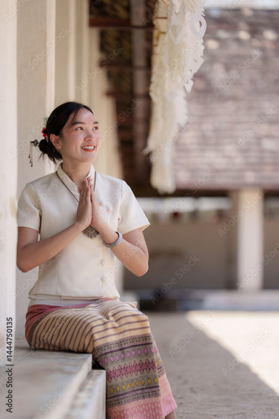 Beautiful young thai woman wearing traditional clothing is sitting and praying with a serene expression at a buddhist temple, showing respect and devotion to her faith