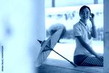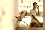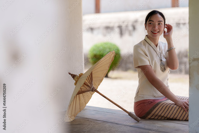 Smiling thai woman dressed in traditional clothing, sitting gracefully with a paper umbrella at a temple, savoring a serene moment of cultural heritage and beauty
